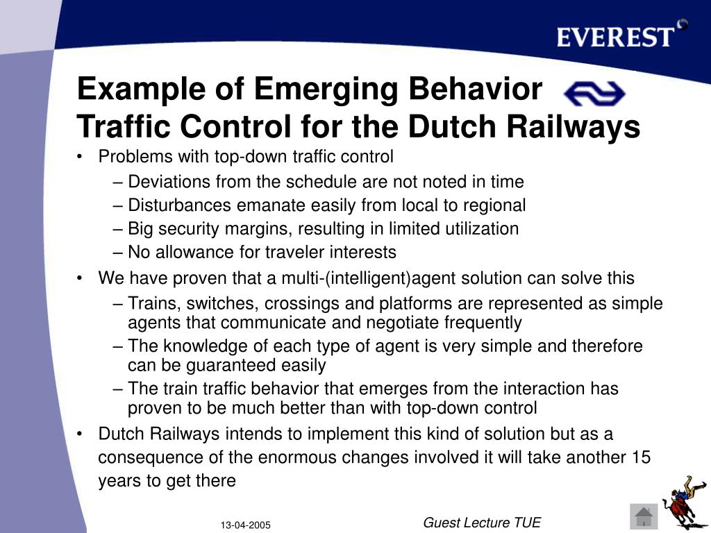 Example of Emerging BehaviorTraffic Control for the Dutch Railways • Problems with top-down traffic control • Deviations from the schedule are not noted in time • Disturbances emanate easily from local to regional • Big security margins, resulting in limited utilization • No allowance for traveler interests • We have proven that a multi-(intelligent)agent solution can solve this • Trains, switches, crossings and platforms are represented as simple agents that communicate and negotiate frequently • The knowledge of each type of agent is very simple and therefore can be guaranteed easily • The train traffic behavior that emerges from the interaction has proven to be much better than with top-down control • Dutch Railways intends to implement this kind of solution but as a consequence of the enormous changes involved it will take another 15 years to get there Guest Lecture TUE
