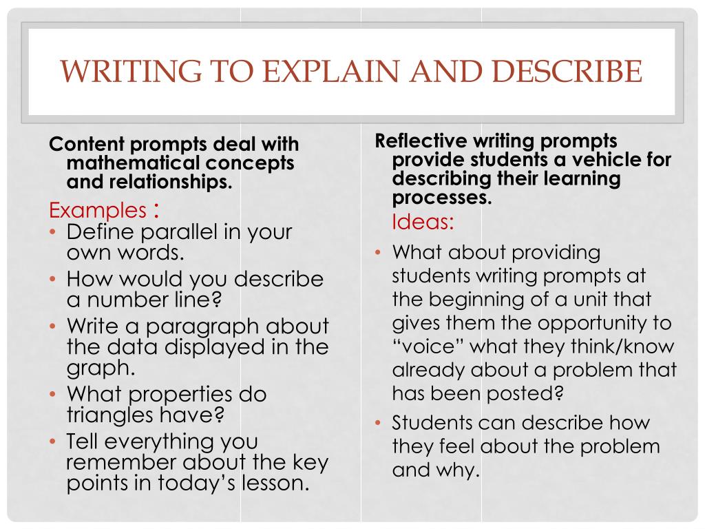Writing to explain and describe Content prompts deal with mathematical concepts and relationships. Examples : • Define parallel in your own words. • How would you describe a number line? • Write a paragraph about the data displayed in the graph. • What properties do triangles have? • Tell everything you remember about the key points in today’s lesson. Reflective writing prompts provide students a vehicle for describing their learning processes. Ideas: • What about providing students writing prompts at the beginning of a unit that gives them the opportunity to “voice” what they think/know already about a problem that has been posted? • Students can describe how they feel about the problem and why.