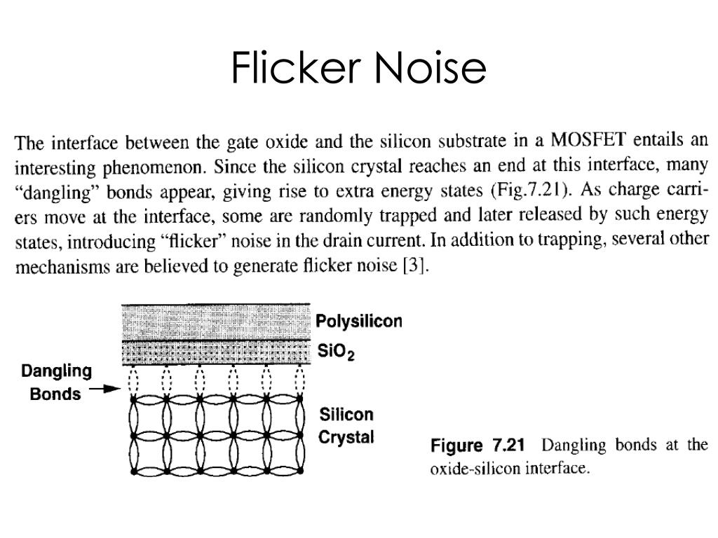 Flicker Noise Model The flicker noise is modeled as a voltage source in series with the gate: The trap-and-release phenomenon associated with the dangling bond occurs at low frequencies more often. Device area can be increased to decrease noise due to flicker noise.