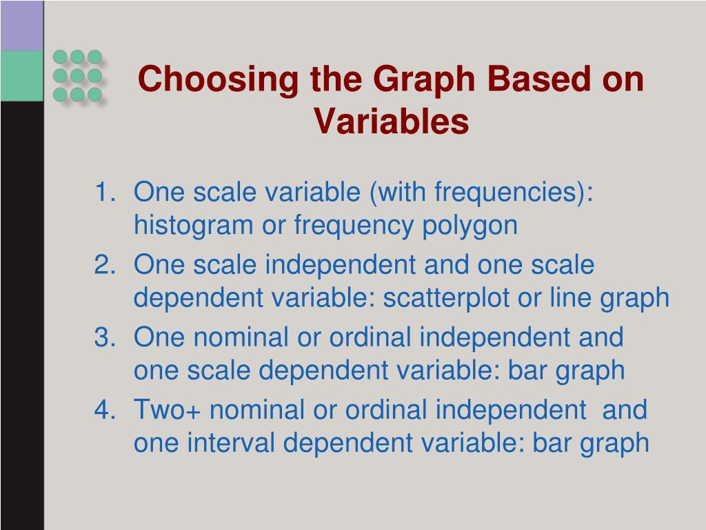 One scale variable (with frequencies): histogram or frequency polygon One scale independent and one scale dependent variable: scatterplot or line graph One nominal or ordinal independent and one scale dependent variable: bar graph Two+ nominal or ordinal independent and one interval dependent variable: bar graph Choosing the Graph Based on Variables