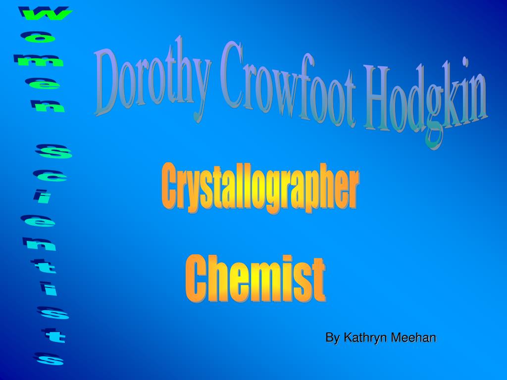 Dorothy Crowfoot Hodgkin. Women Scientists. Crystallographer. Chemist. By Kathryn Meehan. Child Influences. Dorothy Crowfoot was born in Cairo Egypt over 93 years ago. During this time she had two main influences in her childhood.