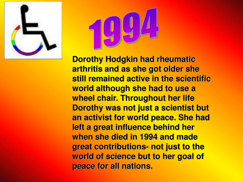 1994 Dorothy Hodgkin had rheumatic arthritis and as she got older she still remained active in the scientific world although she had to use a wheel chair. Throughout her life Dorothy was not just a scientist but an activist for world peace. She had left a great influence behind her when she died in 1994 and made great contributions- not just to the world of science but to her goal of peace for all nations.