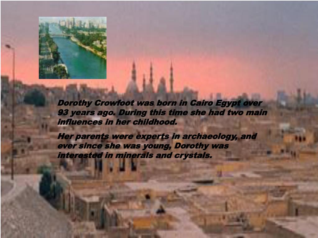 Dorothy Crowfoot was born in Cairo Egypt over 93 years ago. During this time she had two main influences in her childhood. Her parents were experts in archaeology, and ever since she was young, Dorothy was interested in minerals and crystals.