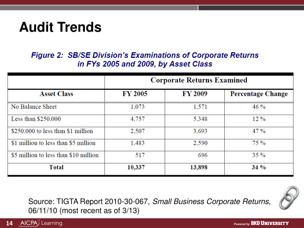 Audit Trends Source: TIGTA Report 2010-30-067, Small Business Corporate Returns, 06/11/10 (most recent as of 3/13)