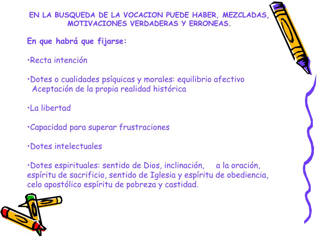 EN LA BUSQUEDA DE LA VOCACION PUEDE HABER, MEZCLADAS, MOTIVACIONES VERDADERAS Y ERRONEAS. • En que habrá que fijarse: • Recta intención • Dotes o cualidades psíquicas y morales: equilibrio afectivo • Aceptación de la propia realidad histórica • La libertad • Capacidad para superar frustraciones • Dotes intelectuales • Dotes espirituales: sentido de Dios, inclinación, a la oración, espíritu de sacrificio, sentido de Iglesia y espíritu de obediencia, celo apostólico espíritu de pobreza y castidad.