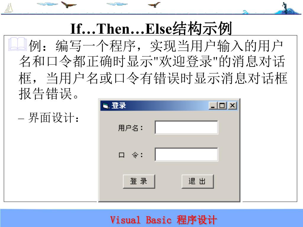 例:编写一个程序,实现当用户输入的用户名和口令都正确时显示"欢迎登录"的消息对话框,当用户名或口令有错误时显示消息对话框报告错误。例:编写一个程序,实现当用户输入的用户名和口令都正确时显示"欢迎登录"的消息对话框,当用户名或口令有错误时显示消息对话框报告错误。 If…Then…Else结构示例 • 界面设计: