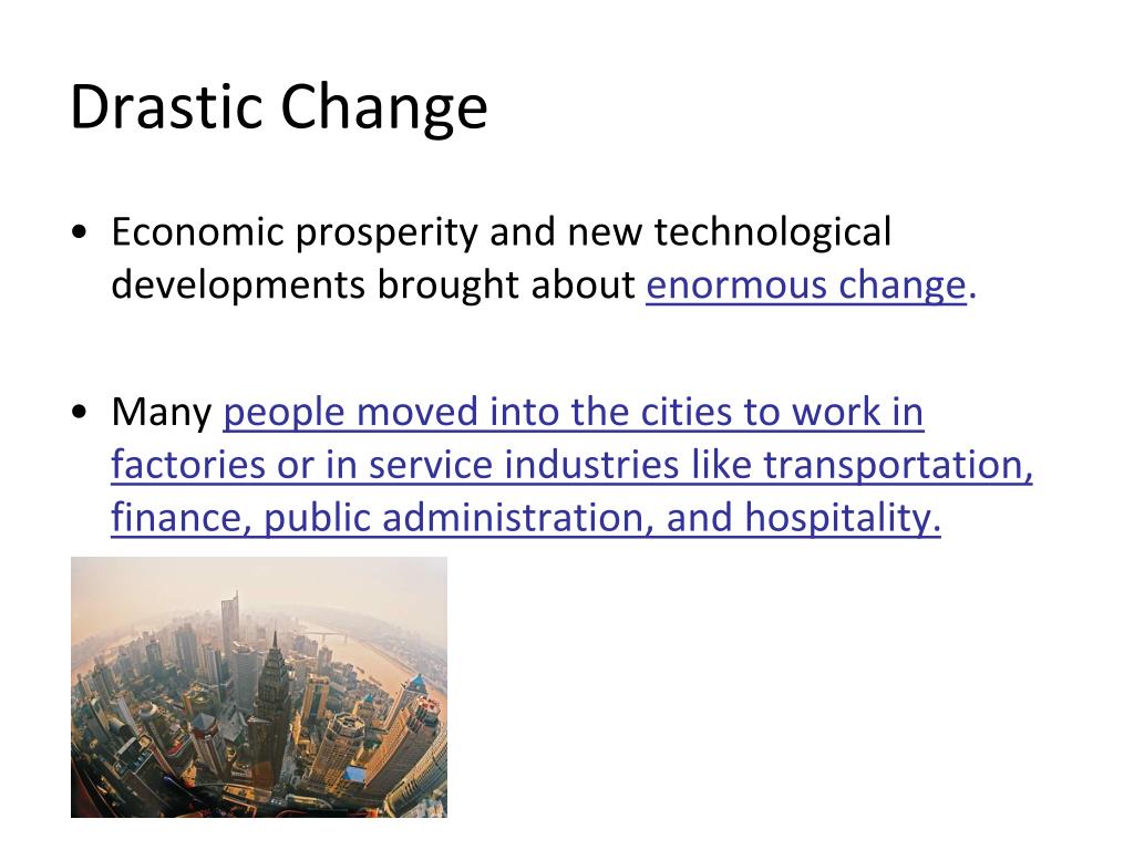 Drastic Change • Economic prosperity and new technological developments brought about enormous change. • Many people moved into the cities to work in factories or in service industries like transportation, finance, public administration, and hospitality.