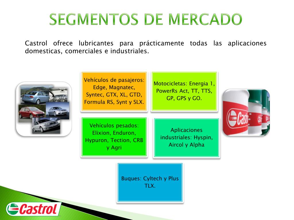 SEGMENTOS DE MERCADO Castrol ofrece lubricantes para prácticamente todas las aplicaciones domesticas, comerciales e industriales.
