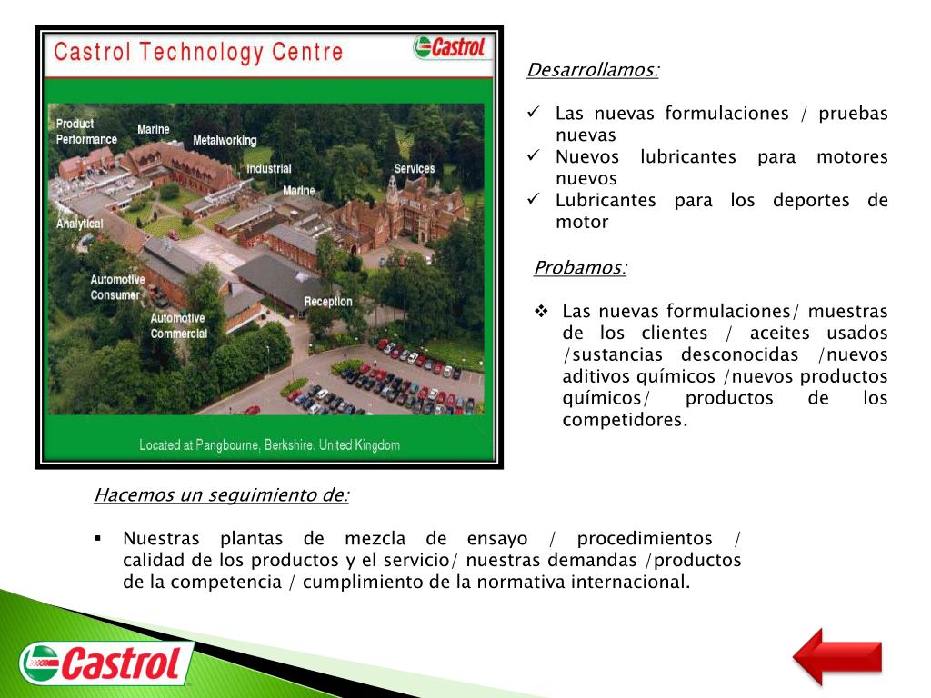 Desarrollamos: • Las nuevas formulaciones / pruebas nuevas • Nuevos lubricantes para motores nuevos • Lubricantes para los deportes de motor • Probamos: • Las nuevas formulaciones/ muestras de los clientes / aceites usados /sustancias desconocidas /nuevos aditivos químicos /nuevos productos químicos/ productos de los competidores. • Hacemos un seguimiento de: • Nuestras plantas de mezcla de ensayo / procedimientos /calidad de los productos y el servicio/ nuestras demandas /productos de la competencia / cumplimiento de la normativa internacional.