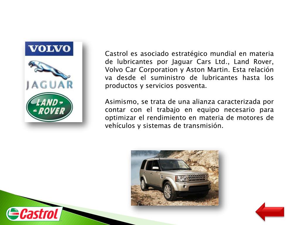 Castrol es asociado estratégico mundial en materia de lubricantes por Jaguar Cars Ltd., Land Rover, Volvo Car Corporation y Aston Martin. Esta relación va desde el suministro de lubricantes hasta los productos y servicios posventa. Asimismo, se trata de una alianza caracterizada por contar con el trabajo en equipo necesario para optimizar el rendimiento en materia de motores de vehículos y sistemas de transmisión.