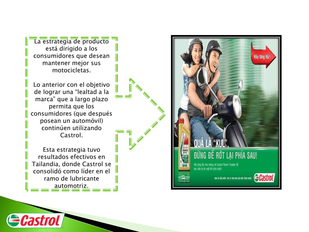 La estrategia de producto está dirigido a los consumidores que desean mantener mejor sus motocicletas. Lo anterior con el objetivo de lograr una “lealtad a la marca” que a largo plazo permita que los consumidores (que después posean un automóvil) continúen utilizando Castrol. Esta estrategia tuvo resultados efectivos en Tailandia, donde Castrol se consolidó como líder en el ramo de lubricante automotriz.