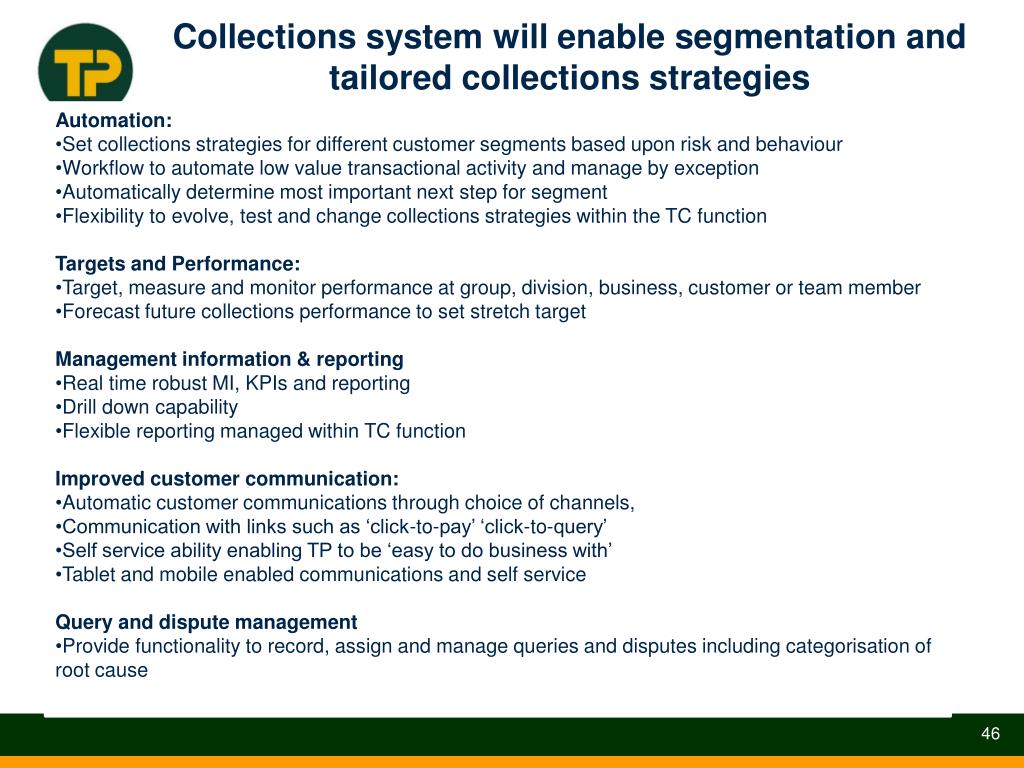 Collections system will enable segmentation and tailored collections strategies • Automation: • Set collections strategies for different customer segments based upon risk and behaviour • Workflow to automate low value transactional activity and manage by exception • Automatically determine most important next step for segment • Flexibility to evolve, test and change collections strategies within the TC function • Targets and Performance: • Target, measure and monitor performance at group, division, business, customer or team member • Forecast future collections performance to set stretch target • Management information & reporting • Real time robust MI, KPIs and reporting • Drill down capability • Flexible reporting managed within TC function • Improved customer communication: • Automatic customer communications through choice of channels, • Communication with links such as ‘click-to-pay’ ‘click-to-query’ • Self service ability enabling TP to be ‘easy to do business with’ • Tablet and mobile enabled communications and self service • Query and dispute management • Provide functionality to record, assign and manage queries and disputes including categorisation of root cause