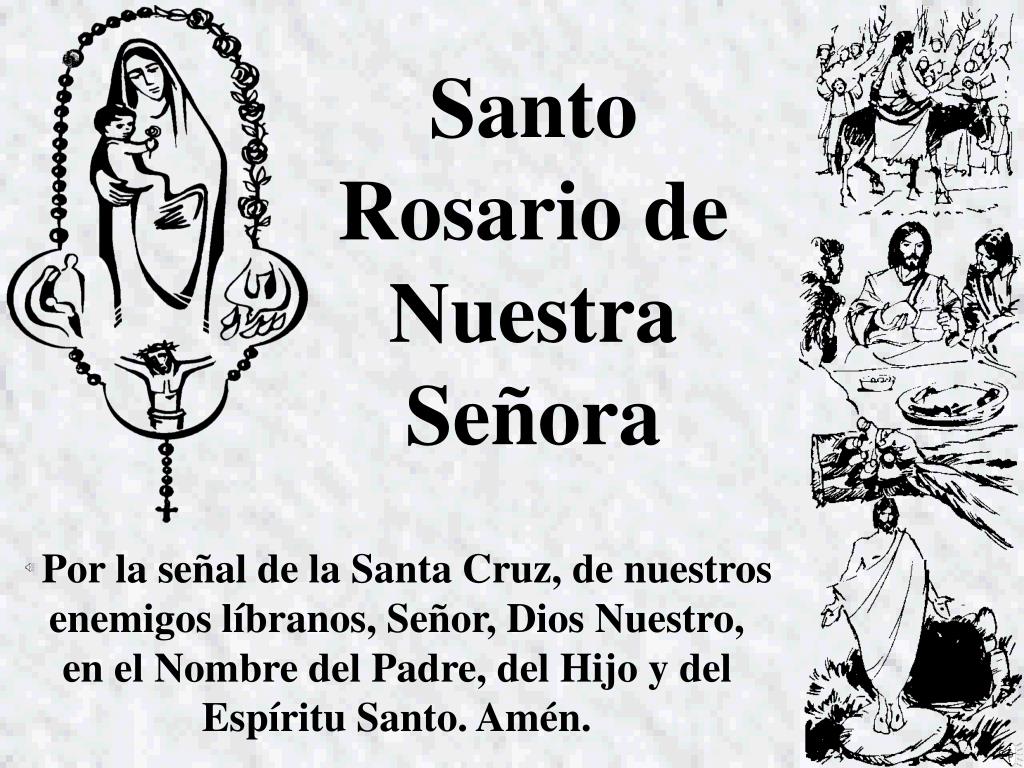 Santo Rosario de Nuestra Señora. Por la señal de la Santa Cruz, de nuestros enemigos líbranos, Señor, Dios Nuestro, e n el Nombre del Padre, del Hijo y del Espíritu Santo. Amén. Haciendo la señal de la Cruz sobre los labios: Abre Tú, Señor, mis labios – y mi boca cantará tus alabanzas.