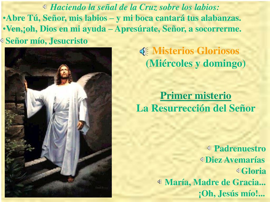 Haciendo la señal de la Cruz sobre los labios: • Abre Tú, Señor, mis labios – y mi boca cantará tus alabanzas. • Ven,¡oh, Dios en mi ayuda – Apresúrate, Señor, a socorrerme. Señor mío, Jesucristo Misterios Gloriosos (Miércoles y domingo) Primer misterio La Resurrección del Señor Padrenuestro Diez Avemarías Gloria María, Madre de Gracia... ¡Oh, Jesús mío!...