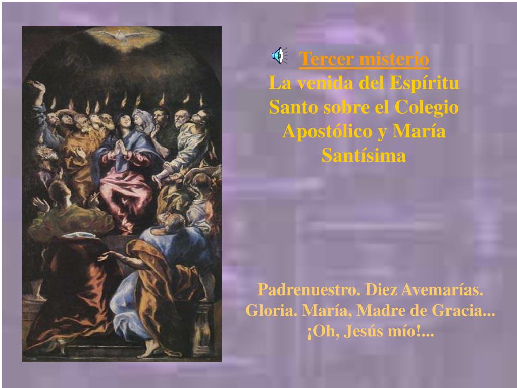 Tercer misterio La venida del Espíritu Santo sobre el Colegio Apostólico y María Santísima Padrenuestro. Diez Avemarías. Gloria.María, Madre de Gracia... ¡Oh, Jesús mío!...