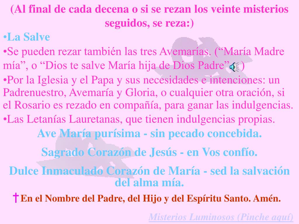 (Al final de cada decena o si se rezan los veinte misterios seguidos, se reza:) • La Salve • Se pueden rezar también las tres Avemarías. (“María Madre mía”, o “Dios te salve María hija de Dios Padre” ) • Por la Iglesia y el Papa y sus necesidades e intenciones: un Padrenuestro, Avemaría y Gloria, o cualquier otra oración, si el Rosario es rezado en compañía, para ganar las indulgencias. • Las Letanías Lauretanas, que tienen indulgencias propias. Ave María purísima - sin pecado concebida. Sagrado Corazón de Jesús - en Vos confío. Dulce Inmaculado Corazón de María - sed la salvación del alma mía. En el Nombre del Padre, del Hijo y del Espíritu Santo. Amén. Misterios Luminosos (Pinche aquí)