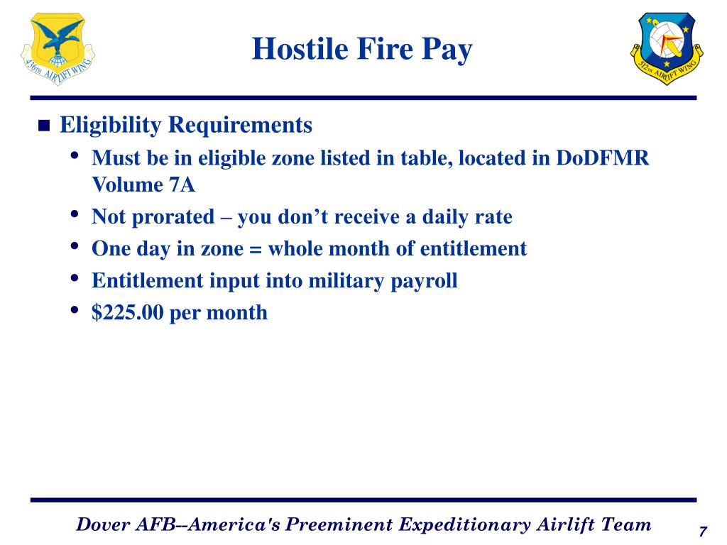 Hostile Fire Pay • Eligibility Requirements • Must be in eligible zone listed in table, located in DoDFMR Volume 7A • Not prorated – you don’t receive a daily rate • One day in zone = whole month of entitlement • Entitlement input into military payroll • $225.00 per month