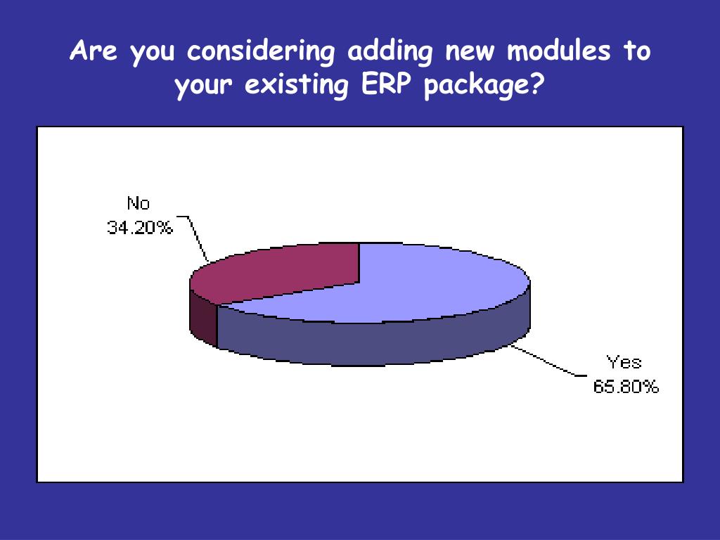 Overview • 375 IT and business professionals • 52% anticipate budget increases for new ERP implementations/new modules • SAP and PeopleSoft/J.D. Edwards were cited as the most popular ERP packages • 46% indicated that the main challenge to successful ERP implementations was inadequate definition of requirements and resistance to change
