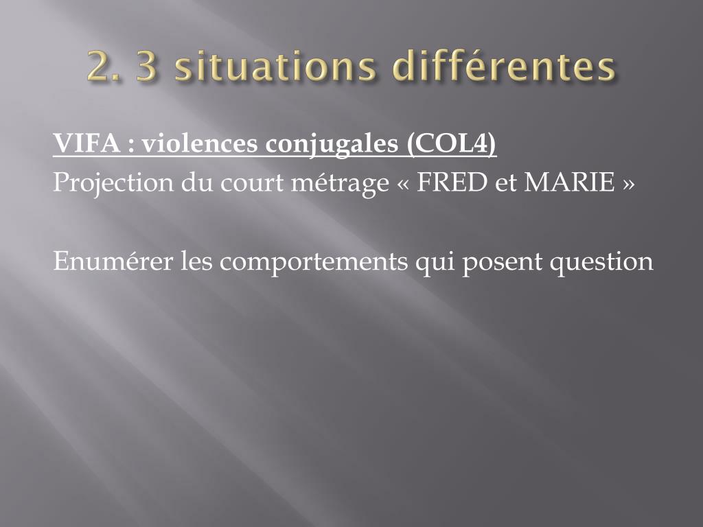 2. 3 situations différentes VIFA : violences conjugales (COL4) Projection du court métrage « FRED et MARIE » Enumérer les comportements qui posent question