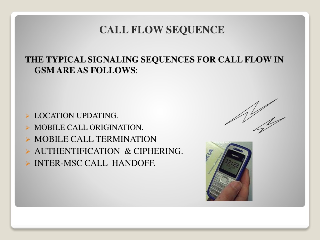 THE TYPICAL SIGNALING SEQUENCES FOR CALL FLOW IN GSM ARE AS FOLLOWS: • LOCATION UPDATING. • MOBILE CALL ORIGINATION. • MOBILE CALL TERMINATION • AUTHENTIFICATION & CIPHERING. • INTER-MSC CALL HANDOFF. CALL FLOW SEQUENCE
