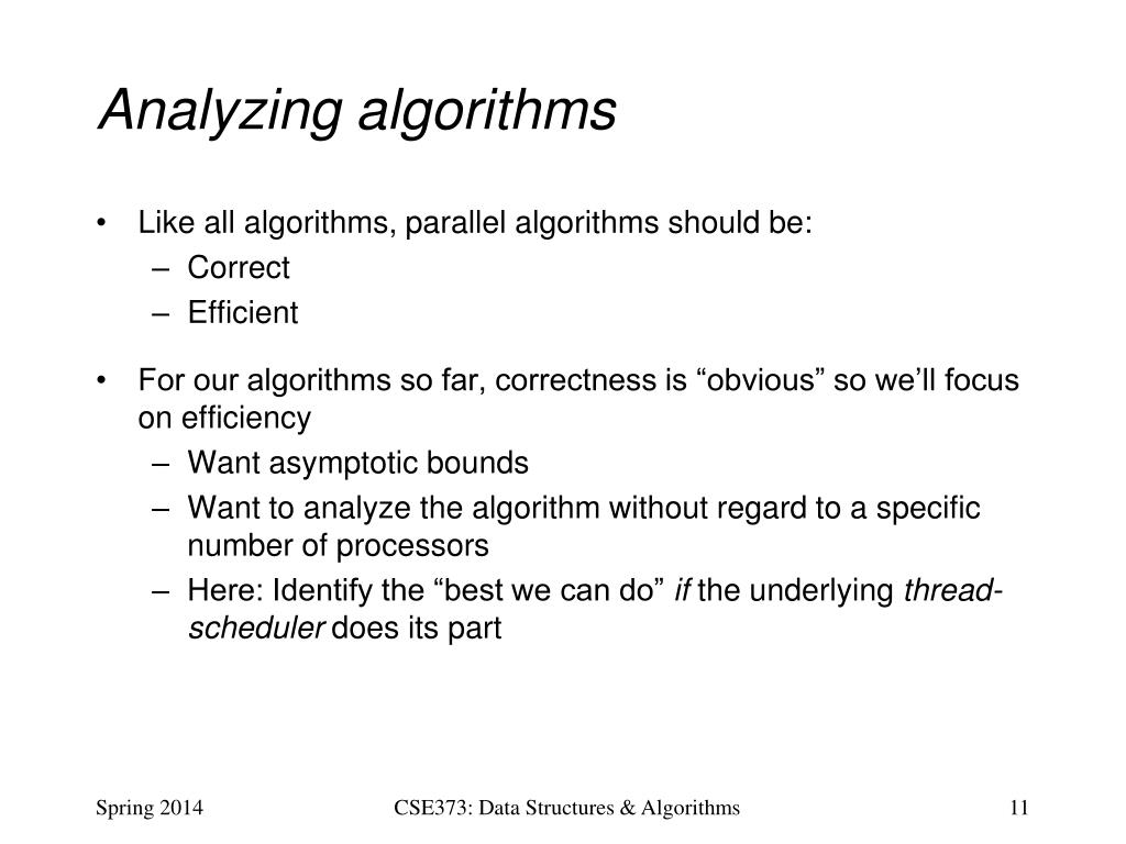 Analyzing algorithms • Like all algorithms, parallel algorithms should be: • Correct • Efficient • For our algorithms so far, correctness is “obvious” so we’ll focus on efficiency • Want asymptotic bounds • Want to analyze the algorithm without regard to a specific number of processors • Here: Identify the “best we can do” if the underlying thread-scheduler does its part CSE373: Data Structures & Algorithms