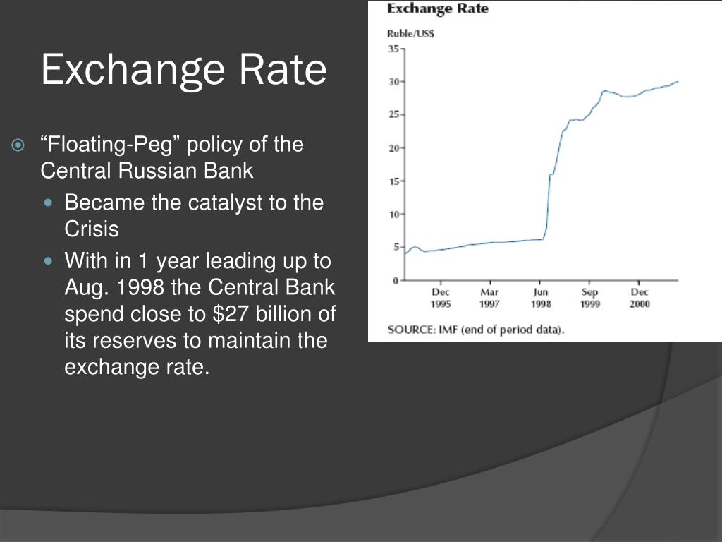 Exchange Rate • “Floating-Peg” policy of the Central Russian Bank • Became the catalyst to the Crisis • With in 1 year leading up to Aug. 1998 the Central Bank spend close to $27 billion of its reserves to maintain the exchange rate.