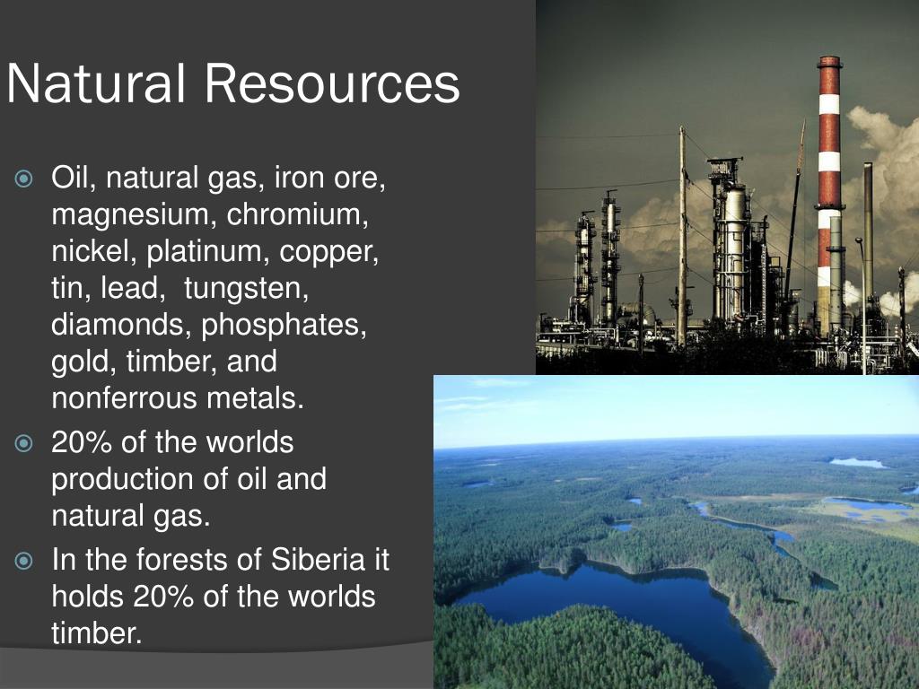 Natural Resources • Oil, natural gas, iron ore, magnesium, chromium, nickel, platinum, copper, tin, lead, tungsten, diamonds, phosphates, gold, timber, and nonferrous metals. • 20% of the worlds production of oil and natural gas. • In the forests of Siberia it holds 20% of the worlds timber.