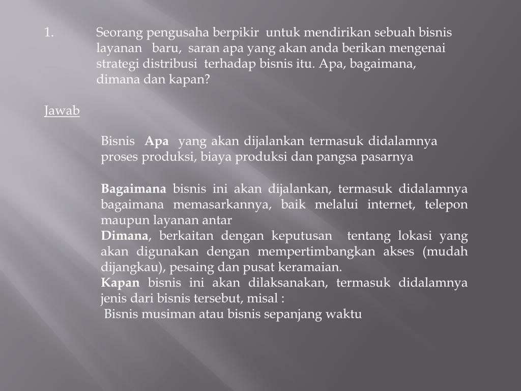 1. Seorangpengusahaberpikiruntukmendirikansebuahbisnislayananbaru, saran apa yang akanandaberikanmengenaistrategidistribusiterhadapbisnisitu. Apa, bagaimana, dimanadankapan? Jawab BisnisApa yang akandijalankantermasukdidalamnyaprosesproduksi, biayaproduksidanpangsapasarnya Bagaimanabisnisiniakandijalankan, termasukdidalamnyabagaimanamemasarkannya, baikmelalui internet, teleponmaupunlayananantar Dimana, berkaitandengankeputusantentanglokasi yang akandigunakandenganmempertimbangkanakses (mudahdijangkau), pesaingdanpusatkeramaian. Kapanbisnisiniakandilaksanakan, termasukdidalamnyajenisdaribisnistersebut, misal : Bisnismusimanataubisnissepanjangwaktu
