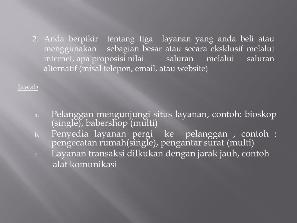 2. Andaberpikirtentangtigalayanan yang andabeliataumenggunakansebagianbesaratausecaraeksklusifmelalui internet, apaproposisinilaisaluranmelaluisaluranalternatif (misaltelepon, email, atau website) • Jawab • Pelangganmengunjungisituslayanan, contoh: bioskop (single), babershop (multi) • Penyedialayananpergikepelanggan , contoh : pengecatanrumah(single), pengantarsurat (multi) • Layanantransaksidilkukandenganjarakjauh,contoh alatkomunikasi