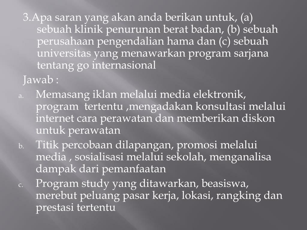 3.Apa saran yang akanandaberikanuntuk, (a) sebuahklinikpenurunanberatbadan, (b) sebuahperusahaanpengendalianhamadan (c) sebuahuniversitas yang menawarkan program sarjanatentang go internasional Jawab : • Memasangiklanmelalui media elektronik, program tertentu ,mengadakankonsultasimelalui internet caraperawatandanmemberikandiskonuntukperawatan • Titikpercobaandilapangan, promosimelalui media , sosialisasimelaluisekolah, menganalisadampakdaripemanfaatan • Program study yang ditawarkan, beasiswa, merebutpeluangpasarkerja, lokasi, rangkingdanprestasitertentu