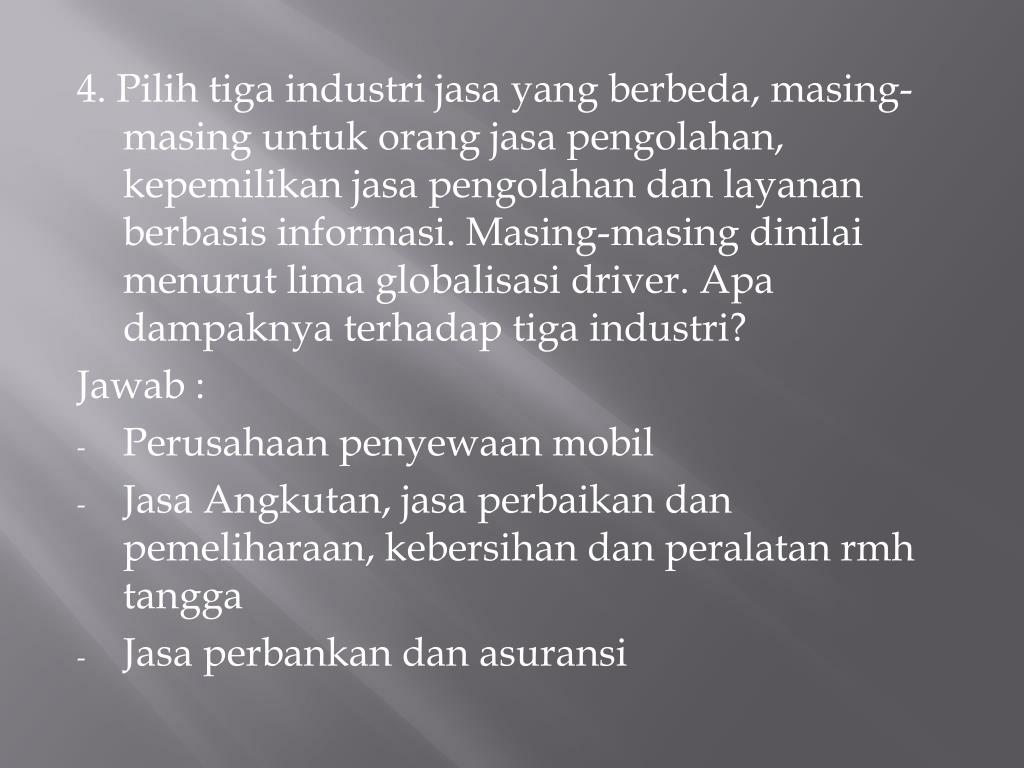 4. Pilihtigaindustrijasa yang berbeda, masing-masinguntukorangjasapengolahan, kepemilikanjasapengolahandanlayananberbasisinformasi. Masing-masingdinilaimenurut lima globalisasi driver. Apadampaknyaterhadaptigaindustri? Jawab : • Perusahaan penyewaanmobil • JasaAngkutan, jasaperbaikandanpemeliharaan, kebersihandanperalatanrmhtangga • Jasaperbankandanasuransi