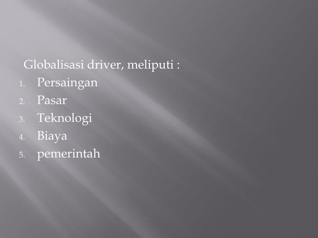 Globalisasi driver, meliputi : • Persaingan • Pasar • Teknologi • Biaya • pemerintah