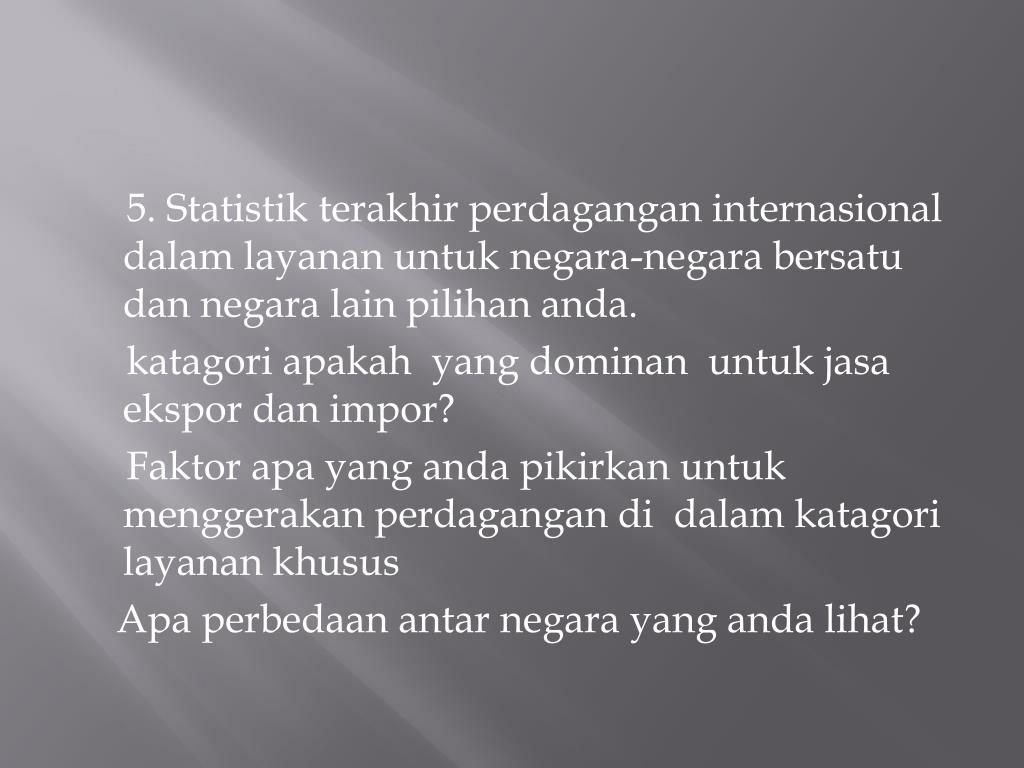 5. Statistikterakhirperdaganganinternasionaldalamlayananuntuknegara-negarabersatudannegara lain pilihananda. katagoriapakah yang dominanuntukjasaekspordanimpor? Faktorapa yang andapikirkanuntukmenggerakanperdagangandidalamkatagorilayanankhusus Apaperbedaanantarnegara yang andalihat?