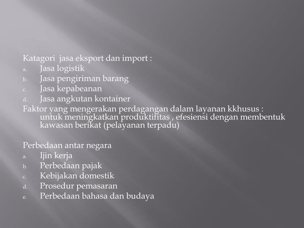 Katagorijasaeksportdan import : • Jasalogistik • Jasapengirimanbarang • Jasakepabeanan • Jasaangkutankontainer Faktor yang mengerakanperdagangandalamlayanankkhusus : untukmeningkatkanproduktifitas , efesiensidenganmembentukkawasanberikat (pelayananterpadu) Perbedaanantarnegara • Ijinkerja • Perbedaanpajak • Kebijakandomestik • Prosedurpemasaran • Perbedaanbahasadanbudaya