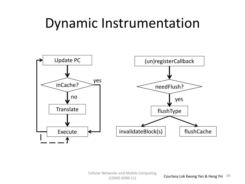 Dynamic Instrumentation Update PC (un)registerCallback yes inCache? needFlush? no yes Translate flushType invalidateBlock(s) flushCache Execute Cellular Networks and Mobile Computing (COMS 6998-11) Courtesy LokKwong Yan & Heng Yin