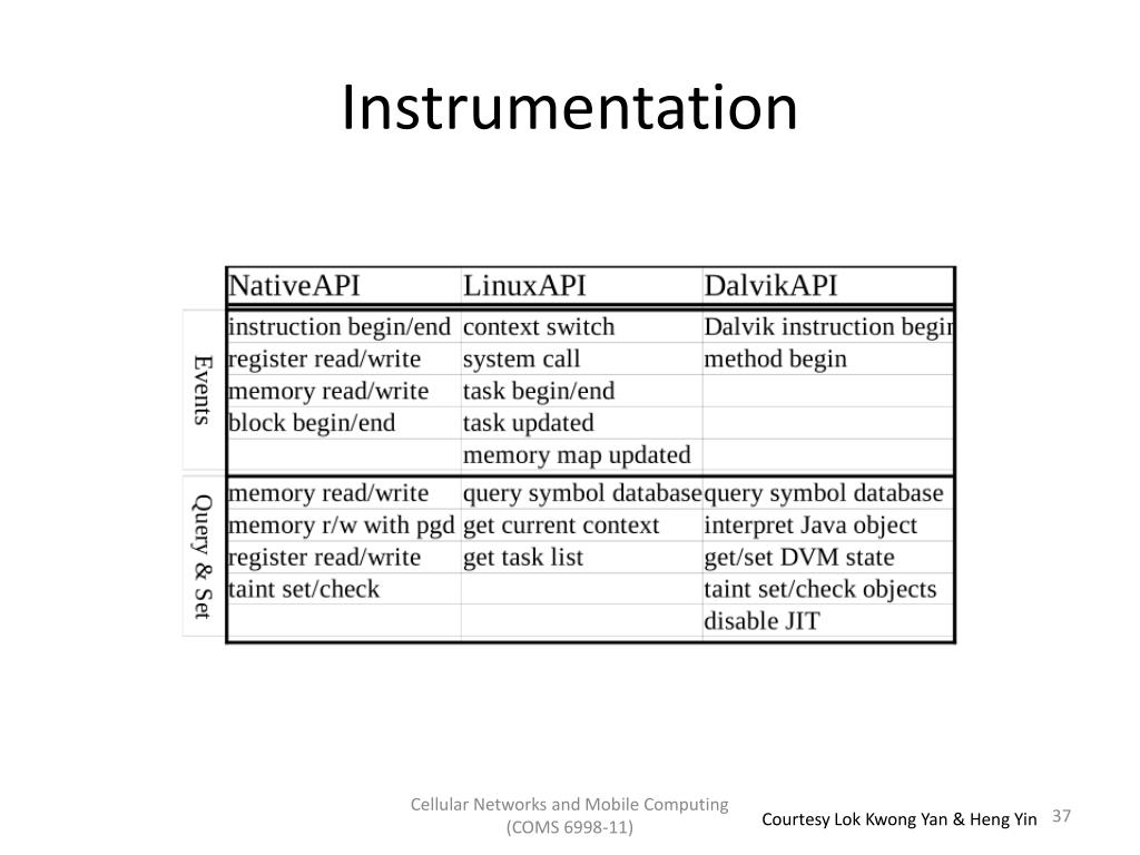 Roadmap • External instrumentation • Linux context • Dalvik context • Extensible: plugin-support / event-based interface • Evaluation • Performance • Usage Cellular Networks and Mobile Computing (COMS 6998-11) Courtesy LokKwong Yan & Heng Yin