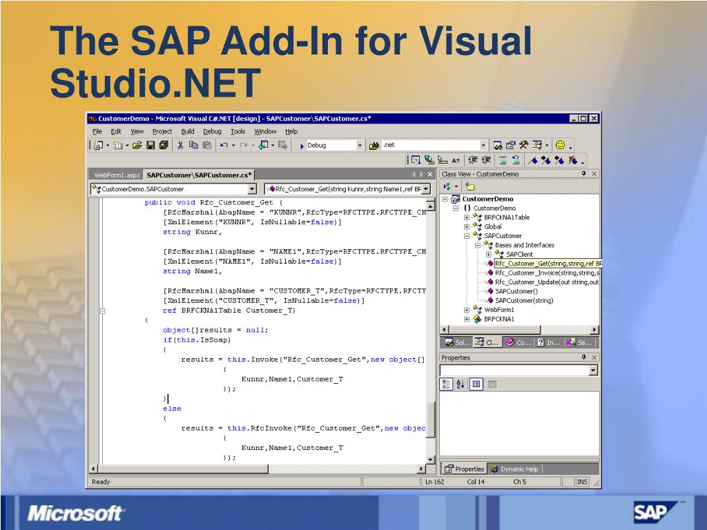 The SAP Add-In for Visual Studio.NET • Build .NET Applications for mySAP using Visual Studio.NET • .NET Web Services • ASP.NET Web Applications • WinForms Applications • SAP AddIn Visual Studio seamlessly integrates with Visual Studio.NET • Interactively add SAP BAPIs into any .NET application from within the IDE