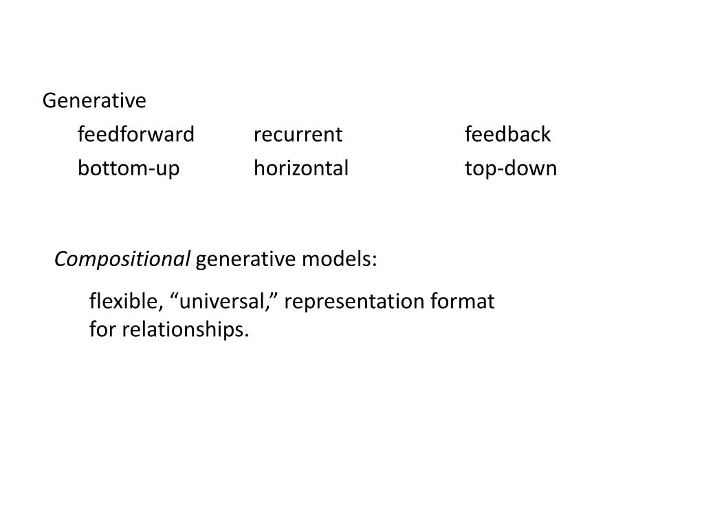 Generative feedforward recurrent feedback bottom-up horizontal top-down Compositional generative models: flexible, “universal,” representation format for relationships.