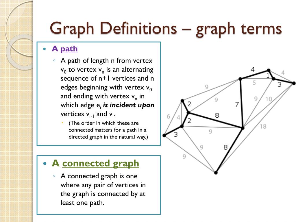 Graph Definitions – graph terms • A path • A path of length n from vertex v0 to vertex vn is an alternating sequence of n+1 vertices and n edges beginning with vertex v0 and ending with vertex vn in which edge eiis incident upon vertices vi-1 and vi. • (The order in which these are connected matters for a path in a directed graph in the natural way.) • A connected graph • A connected graph is one where any pair of vertices in the graph is connected by at least one path.