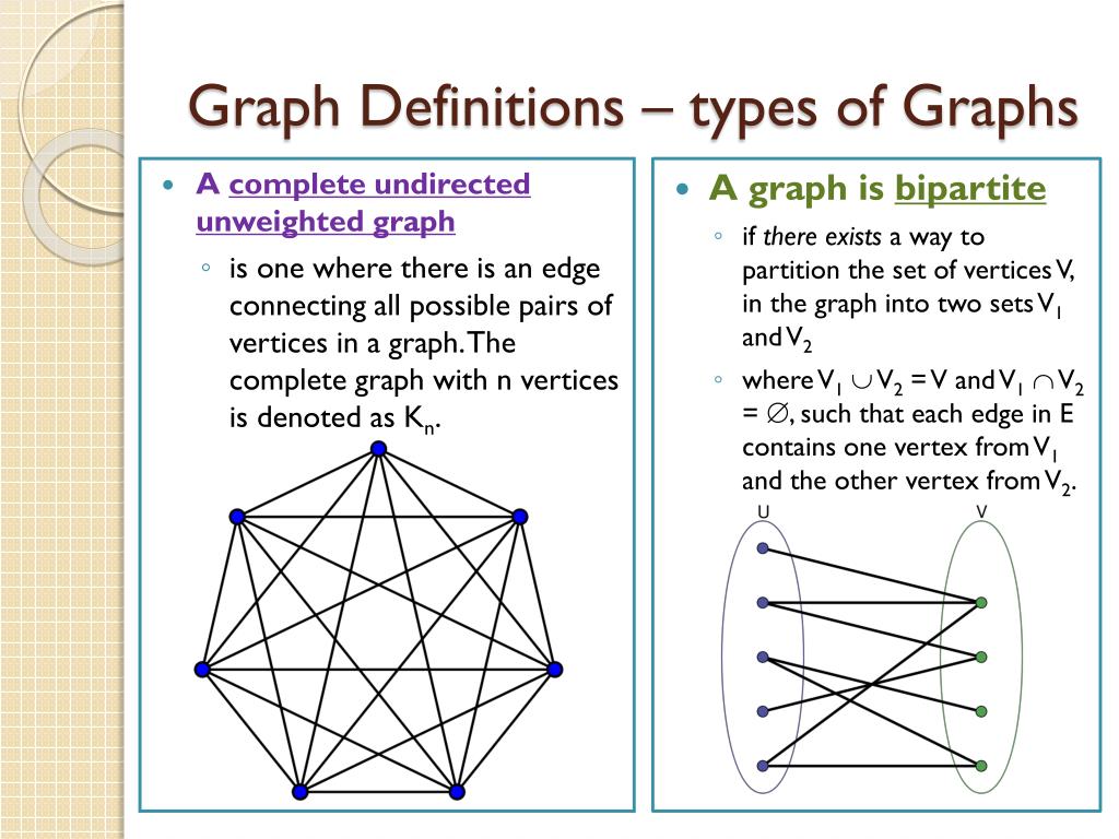 Graph Definitions – types of Graphs • A complete undirected unweighted graph • is one where there is an edge connecting all possible pairs of vertices in a graph. The complete graph with n vertices is denoted as Kn. • A graph is bipartite • if there exists a way to partition the set of vertices V, in the graph into two sets V1 and V2 • where V1 V2 = V and V1 V2 = , such that each edge in E contains one vertex from V1 and the other vertex from V2.
