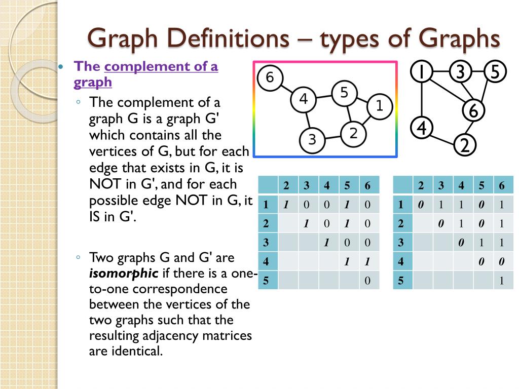 Graph Definitions – types of Graphs 1 3 5 • The complement of a graph • The complement of a graph G is a graph G' which contains all the vertices of G, but for each edge that exists in G, it is NOT in G', and for each possible edge NOT in G, it IS in G'. • Two graphs G and G' are isomorphic if there is a one-to-one correspondence between the vertices of the two graphs such that the resulting adjacency matrices are identical. 6 4 2