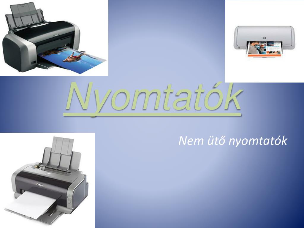 Nyomtatók. Nem ütő nyomtatók. Általános tulajdonságok. Párhuzamos nyomtatóport, USB DPI: dot per inch ( inch =2,54 cm). Hány képpont fér el egy inchen. Lap/perc. Tintasugaras nyomtatók. Tintacseppeket juttat a papírra.