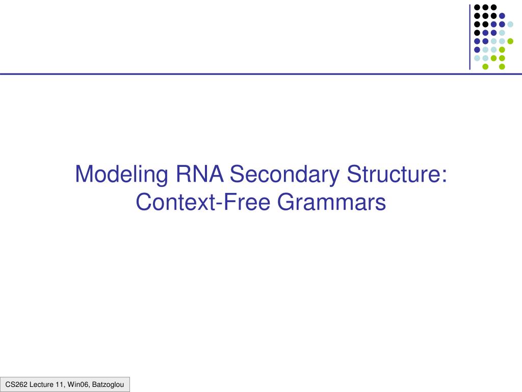 Example: modeling a stem loop AG U CG S a W1 u | g W1 u W1 c W2 g W2 g W3 c | g W3 u W3 g L c | a L u L agucg | agccg | cugugc More general: Any 4-long stem, 3-5-long loop: S aW1u | gW1u | gW1c | cW1g | uW1g | uW1a W1 aW2u | gW2u | gW2c | cW2g | uW2g | uW2a W2 aW3u | gW3u | gW3c | cW3g | uW3g | uW3a W3 aLu | gLu | gLc | cLg | uLg | uLa L aL1 | cL1 | gL1 | uL1 L1 aL2 | cL2 | gL2 | uL2 L2 a | c | g | u | aa | … | uu | aaa | … | uuu ACGG UGCC AG C CG GCGA UGCU CUG U CG GCGA UGUU