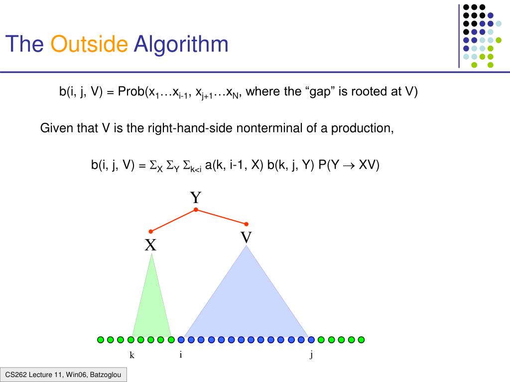 Algorithm: Outside Initialization: b(1, N, S) = 1 For any other V, b(1, N, V) = 0 Iteration: For i = 1 to N-1 For j = N down to i For V a nonterminal b(i, j, V) = X Y k<i a(k, i-1, X) b(k, j, Y) P(Y XV) + X Y k<i a(j+1, k, X) b(i, k, Y) P(Y VX) Termination: It is true for any i, that: P(x | ) = X b(i, i, X) P(X xi)
