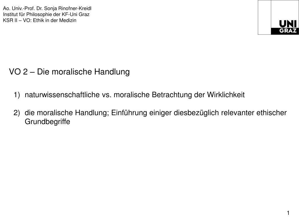 Ao. Univ.-Prof. Dr. Sonja Rinofner-KreidlInstitut für Philosophie der KF-Uni GrazKSR II – VO: Ethik in der Medizin VO 2 – Die moralische Handlung • naturwissenschaftliche vs. moralische Betrachtung der Wirklichkeit • die moralische Handlung; Einführung einiger diesbezüglich relevanter ethischer Grundbegriffe 1