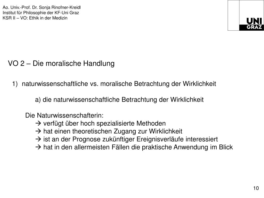 Ao. Univ.-Prof. Dr. Sonja Rinofner-KreidlInstitut für Philosophie der KF-Uni GrazKSR II – VO: Ethik in der Medizin VO 2 – Die moralische Handlung • naturwissenschaftliche vs. moralische Betrachtung der Wirklichkeit • a) die naturwissenschaftliche Betrachtung der Wirklichkeit Die Naturwissenschafterin: verfügt über hoch spezialisierte Methoden hat einen theoretischen Zugang zur Wirklichkeit ist an der Prognose zukünftiger Ereignisverläufe interessiert 9