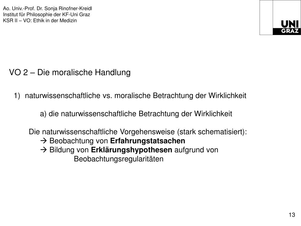 Ao. Univ.-Prof. Dr. Sonja Rinofner-KreidlInstitut für Philosophie der KF-Uni GrazKSR II – VO: Ethik in der Medizin VO 2 – Die moralische Handlung • naturwissenschaftliche vs. moralische Betrachtung der Wirklichkeit • a) die naturwissenschaftliche Betrachtung der Wirklichkeit Die naturwissenschaftliche Vorgehensweise (stark schematisiert): Beobachtung von Erfahrungstatsachen 12