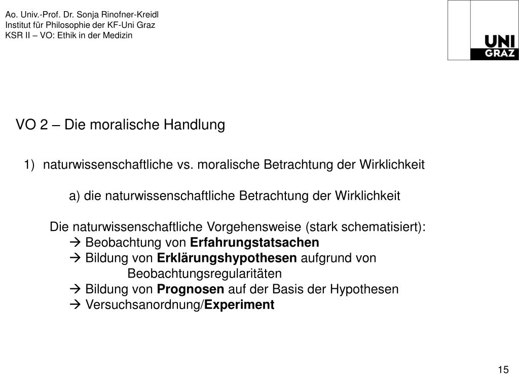 Ao. Univ.-Prof. Dr. Sonja Rinofner-KreidlInstitut für Philosophie der KF-Uni GrazKSR II – VO: Ethik in der Medizin VO 2 – Die moralische Handlung • naturwissenschaftliche vs. moralische Betrachtung der Wirklichkeit • a) die naturwissenschaftliche Betrachtung der Wirklichkeit Die naturwissenschaftliche Vorgehensweise (stark schematisiert): Beobachtung von Erfahrungstatsachen Bildung von Erklärungshypothesen aufgrund von Beobachtungsregularitäten Bildung von Prognosen auf der Basis der Hypothesen 14