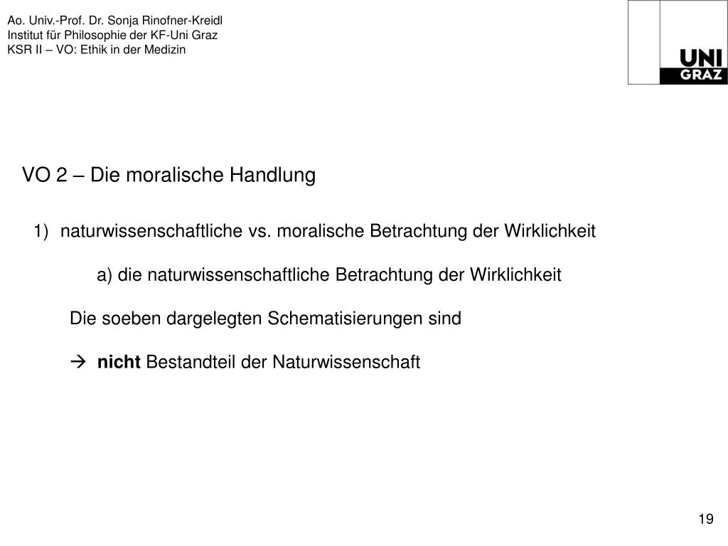 Ao. Univ.-Prof. Dr. Sonja Rinofner-KreidlInstitut für Philosophie der KF-Uni GrazKSR II – VO: Ethik in der Medizin VO 2 – Die moralische Handlung • naturwissenschaftliche vs. moralische Betrachtung der Wirklichkeit • a) die naturwissenschaftliche Betrachtung der Wirklichkeit Die soeben dargelegten Schematisierungen sind 18