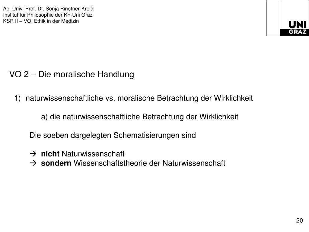 Ao. Univ.-Prof. Dr. Sonja Rinofner-KreidlInstitut für Philosophie der KF-Uni GrazKSR II – VO: Ethik in der Medizin VO 2 – Die moralische Handlung • naturwissenschaftliche vs. moralische Betrachtung der Wirklichkeit • a) die naturwissenschaftliche Betrachtung der Wirklichkeit Die soeben dargelegten Schematisierungen sind nicht Bestandteil derNaturwissenschaft 19